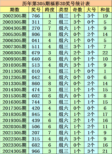 历年第305期福彩3D同期奖号为:766 - 311 - 270 - 806 - 041 - 511 - 679 - 640 - 513 - 010 - 042 - 860 - 474 - 602 - 744 - 420 - 845 - 439 - 506 - 207 - 315 - 682 - 966。