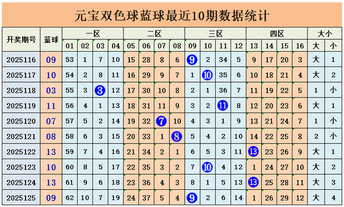 上期回顾:双色球第2025125期开出奖号:红球03、09、12、13、26、32;蓝球09,其中红球三区比为2:2:2,奇偶比3:3,蓝球开出大奇数号码09。