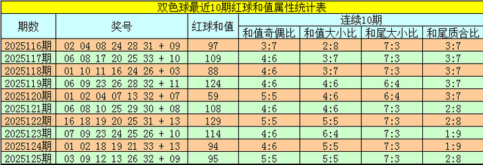 双色球红球最近10期开出和值分别为:97、109、88、124、59、108、129、114、94、95。