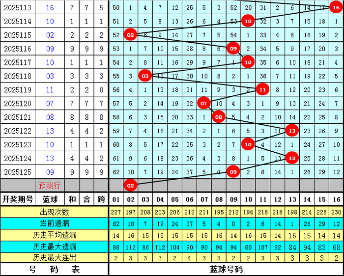 和值跨度分析:上期和值开出95,对比第2025124期和值上升了1个点位,本期预计和值在大号区域热出,看好出现在143附近。