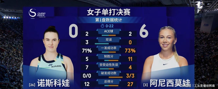 非凡娱乐第一盘上来,阿尼西莫娃love game保发,诺斯科娃的发球局则是遭遇了不小的考验,阿尼西莫娃率先破发2-0开局!第3局阿尼西莫娃发球局遇到阻力、仍然是继续保发3-0巩固优势,诺斯科娃看上去气势不足,一发成功率不高,阿尼西莫娃在第4局再次破发,4-0领先,这不会是奔着送蛋去了吧?第5局阿尼西莫娃顺利保发,5-0。第6局,诺斯科娃40-0的情况下也未能保发,阿尼西莫娃第3次破发6-0送蛋拿下,大比分1-0领先诺斯科娃。
