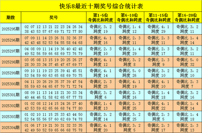 福彩快乐8第2025304期开奖回顾奖号:01 06 17 19 21 30 31 32 33 35 42 49 50 52 59 65 66 68 75 78,其中奖号奇偶比为11:9,大小比为11:9,跨度为77。